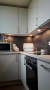 Die modern eingerichtete Küche: Herd mit Backofen, Mikrowelle und Spülmaschine gehören zur Standardausrüstung.