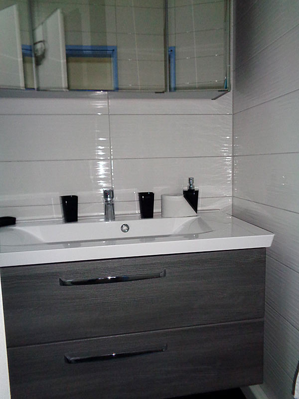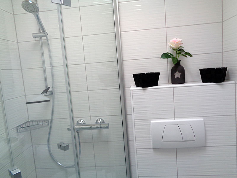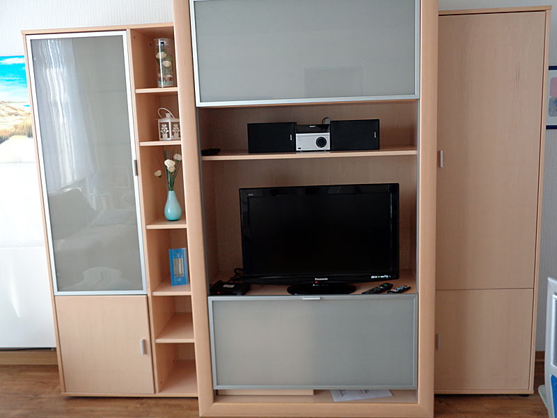 Das schön ein gerichtete Bad verfügt über Dusche, WC, Waschbecken, Fön und einen Wandschrank. Der Wohn- und Essraum ist mit Fernseher, Radio und CD-Player sowie Telefon ausgestattet.