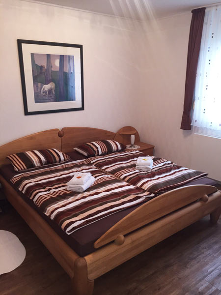Ihre Nachtruhe verbringen Sie im Schlafzimmer, in dem auch ein Beistellbett für ein Kleinkind aufgestellt ist.